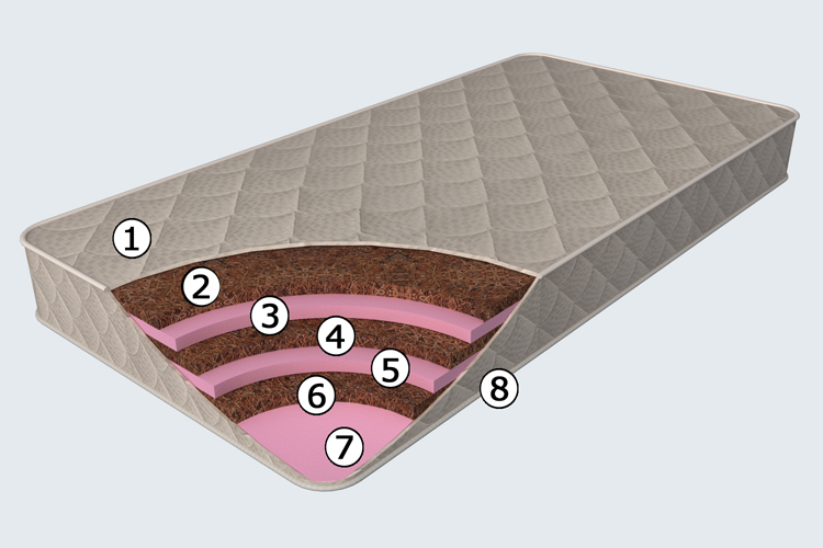 Кокос - это натуральный материал, получаемый из ореха кокосовой пальмы. Не поддается гниению, на долгие годы сохраняет упругость и жесткость, гипоаллергенен. Кокос в составе матраса используется в качестве жесткой и упругой прослойки.